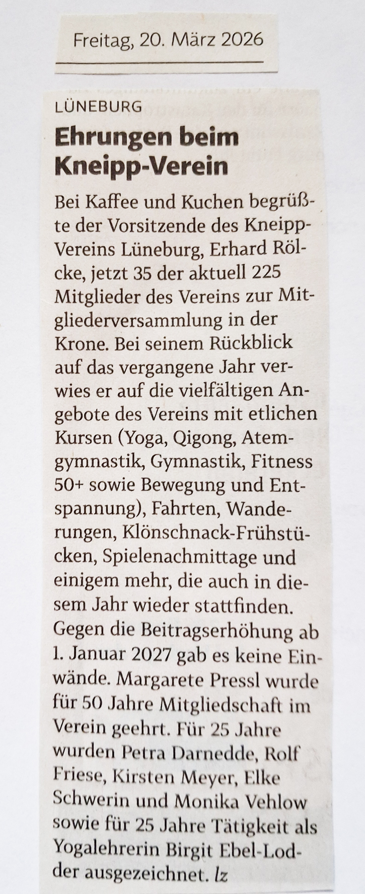 Pressebericht "Ehrungen beim Kneipp-Verein" 20. März 2026